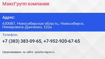 МаксГрупп, компания по адресу 630087, Новосибирская область, Новосибирск, Немировича-Данченко, 122а в дальнейшем Организация, размещена в следующих категориях: