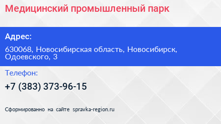 Медицинский промышленный парк по адресу 630068, Новосибирская область, Новосибирск, Одоевского, 3 в дальнейшем Организация, размещена в следующих категориях: