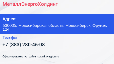 МеталлЭнергоХолдинг по адресу 630005, Новосибирская область, Новосибирск, Фрунзе, 124 в дальнейшем Организация, размещена в следующих категориях:
