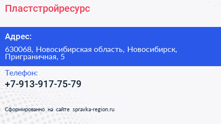 Пластстройресурс по адресу 630068, Новосибирская область, Новосибирск, Приграничная, 5 в дальнейшем Организация, размещена в следующих категориях: