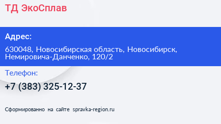 ТД ЭкоСплав по адресу 630048, Новосибирская область, Новосибирск, Немировича-Данченко, 120/2 в дальнейшем Организация, размещена в следующих категориях:
