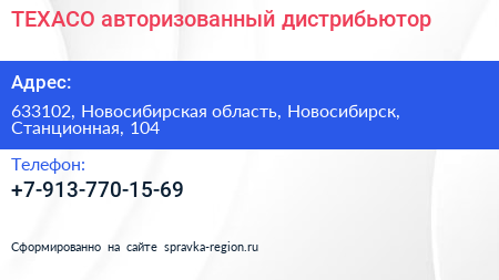 TEXACO, авторизованный дистрибьютор по адресу 633102, Новосибирская область, Новосибирск, Станционная, 104 в дальнейшем Организация, размещена в следующих категориях: