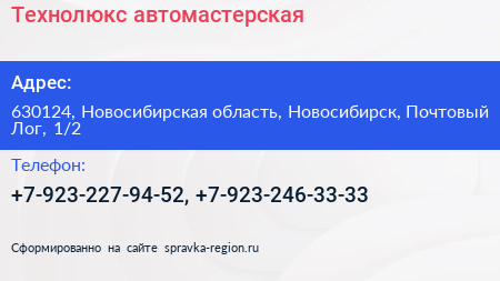 Технолюкс, автомастерская по адресу 630124, Новосибирская область, Новосибирск, Почтовый Лог, 1/2 в дальнейшем Организация, размещена в следующих категориях: