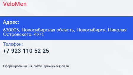 VeloMen по адресу 630005, Новосибирская область, Новосибирск, Николая Островского, 49/1 в дальнейшем Организация, размещена в следующих категориях: