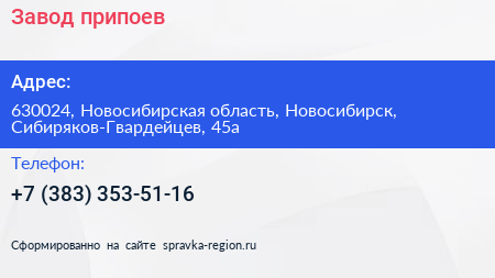 Завод припоев по адресу 630024, Новосибирская область, Новосибирск, Сибиряков-Гвардейцев, 45а в дальнейшем Организация, размещена в следующих категориях: