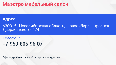 Маэстро, мебельный салон по адресу 630015, Новосибирская область, Новосибирск, проспект Дзержинского, 1/4 в дальнейшем Организация, размещена в следующих категориях: