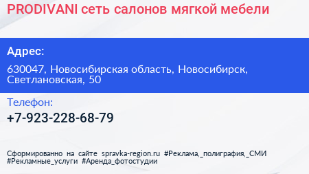 PRODIVANI, сеть салонов мягкой мебели по адресу 630047, Новосибирская область, Новосибирск, Светлановская, 50 в дальнейшем Организация, размещена в следующих категориях: