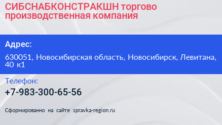 СИБСНАБКОНСТРАКШН, торгово-производственная компания по адресу 630051, Новосибирская область, Новосибирск, Левитана, 40 к1 в дальнейшем Организация, размещена в следующих категориях: