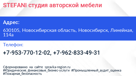 STEFANI, студия авторской мебели по адресу 630105, Новосибирская область, Новосибирск, Линейная, 114а в дальнейшем Организация, размещена в следующих категориях:
