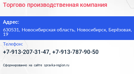 Торгово-производственная компания по адресу 630531, Новосибирская область, Новосибирск, Берёзовая, 19 в дальнейшем Организация, размещена в следующих категориях: