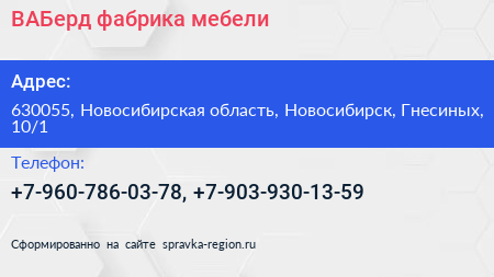 ВАБерд, фабрика мебели по адресу 630055, Новосибирская область, Новосибирск, Гнесиных, 10/1 в дальнейшем Организация, размещена в следующих категориях:
