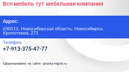 Вся мебель тут, мебельная компания по адресу 630111, Новосибирская область, Новосибирск, Кропоткина, 271 в дальнейшем Организация, размещена в следующих категориях: