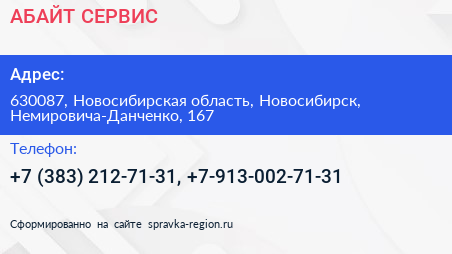 АБАЙТ СЕРВИС по адресу 630087, Новосибирская область, Новосибирск, Немировича-Данченко, 167 в дальнейшем Организация, размещена в следующих категориях: