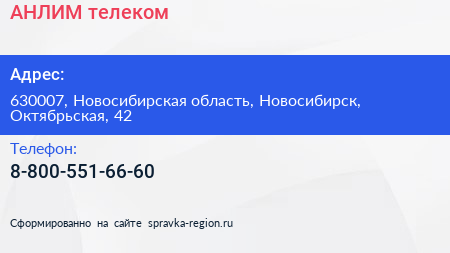 АНЛИМ телеком по адресу 630007, Новосибирская область, Новосибирск, Октябрьская, 42 в дальнейшем Организация, размещена в следующих категориях: