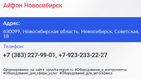 Айфон Новосибирск по адресу 630099, Новосибирская область, Новосибирск, Советская, 18 в дальнейшем Организация, размещена в следующих категориях: