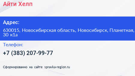 Айти Хелп по адресу 630015, Новосибирская область, Новосибирск, Планетная, 30 к1а в дальнейшем Организация, размещена в следующих категориях: