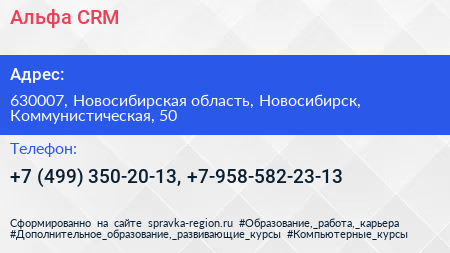 Альфа CRM по адресу 630007, Новосибирская область, Новосибирск, Коммунистическая, 50 в дальнейшем Организация, размещена в следующих категориях: