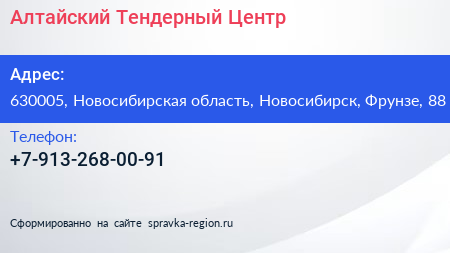 Алтайский Тендерный Центр по адресу 630005, Новосибирская область, Новосибирск, Фрунзе, 88 в дальнейшем Организация, размещена в следующих категориях: