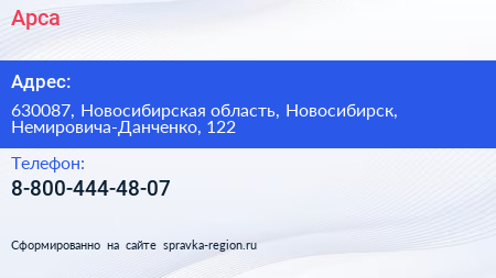 Арса по адресу 630087, Новосибирская область, Новосибирск, Немировича-Данченко, 122 в дальнейшем Организация, размещена в следующих категориях: