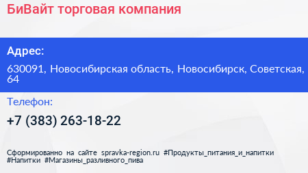 БиВайт, торговая компания по адресу 630091, Новосибирская область, Новосибирск, Советская, 64 в дальнейшем Организация, размещена в следующих категориях: