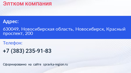 Элтком, компания по адресу 630049, Новосибирская область, Новосибирск, Красный проспект, 200 в дальнейшем Организация, размещена в следующих категориях: