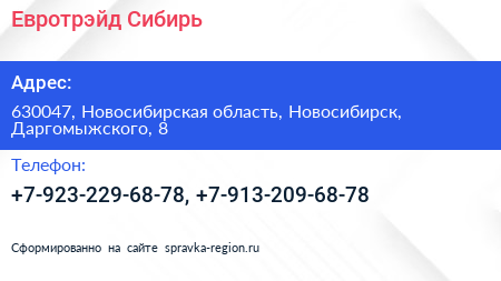 Евротрэйд Сибирь по адресу 630047, Новосибирская область, Новосибирск, Даргомыжского, 8 в дальнейшем Организация, размещена в следующих категориях: