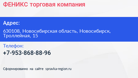 ФЕНИКС, торговая компания по адресу 630108, Новосибирская область, Новосибирск, Троллейная, 15 в дальнейшем Организация, размещена в следующих категориях: