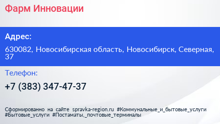 Фарм Инновации по адресу 630082, Новосибирская область, Новосибирск, Северная, 37 в дальнейшем Организация, размещена в следующих категориях: