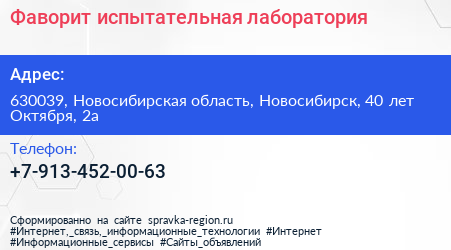 Фаворит, испытательная лаборатория по адресу 630039, Новосибирская область, Новосибирск, 40 лет Октября, 2а в дальнейшем Организация, размещена в следующих категориях: