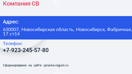 Компания СВ по адресу 630007, Новосибирская область, Новосибирск, Фабричная, 17 ст14 в дальнейшем Организация, размещена в следующих категориях:
