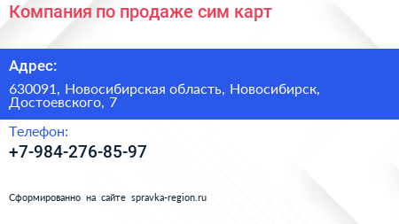Компания по продаже сим-карт по адресу 630091, Новосибирская область, Новосибирск, Достоевского, 7 в дальнейшем Организация, размещена в следующих категориях:
