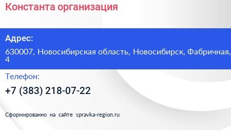 Константа, организация по адресу 630007, Новосибирская область, Новосибирск, Фабричная, 4 в дальнейшем Организация, размещена в следующих категориях: