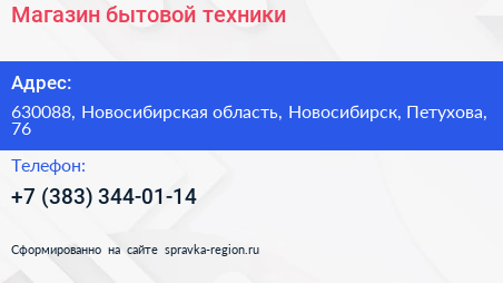 Магазин бытовой техники по адресу 630088, Новосибирская область, Новосибирск, Петухова, 76 в дальнейшем Организация, размещена в следующих категориях: