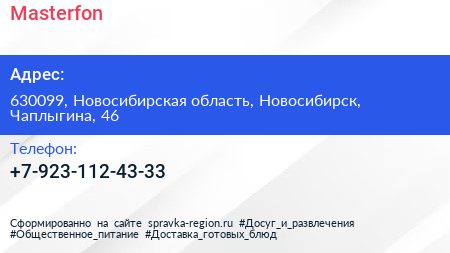 Masterfon по адресу 630099, Новосибирская область, Новосибирск, Чаплыгина, 46 в дальнейшем Организация, размещена в следующих категориях: