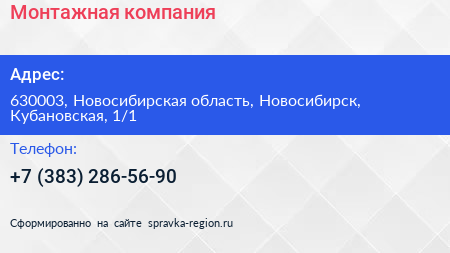 Монтажная компания по адресу 630003, Новосибирская область, Новосибирск, Кубановская, 1/1 в дальнейшем Организация, размещена в следующих категориях: