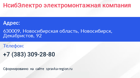 НсибЭлектро, электромонтажная компания по адресу 630009, Новосибирская область, Новосибирск, Декабристов, 92 в дальнейшем Организация, размещена в следующих категориях: