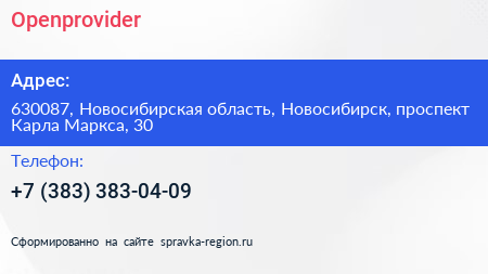 Openprovider по адресу 630087, Новосибирская область, Новосибирск, проспект Карла Маркса, 30 в дальнейшем Организация, размещена в следующих категориях: