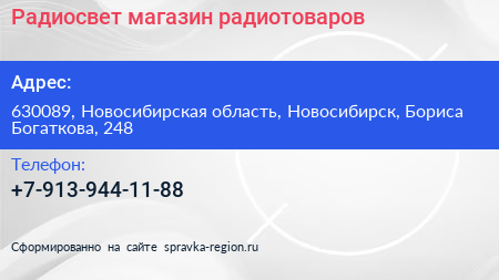 Радиосвет, магазин радиотоваров по адресу 630089, Новосибирская область, Новосибирск, Бориса Богаткова, 248 в дальнейшем Организация, размещена в следующих категориях: