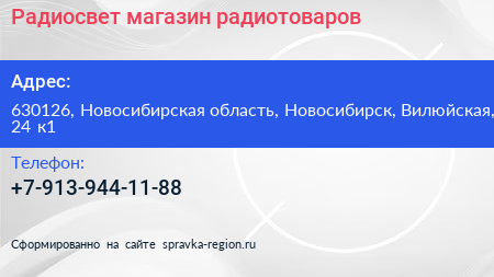 Радиосвет, магазин радиотоваров по адресу 630126, Новосибирская область, Новосибирск, Вилюйская, 24 к1 в дальнейшем Организация, размещена в следующих категориях:
