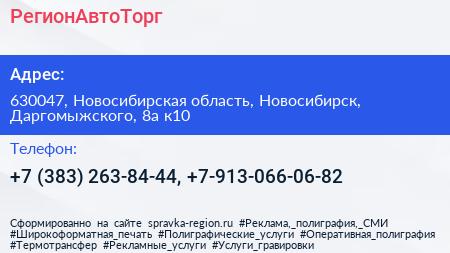 РегионАвтоТорг по адресу 630047, Новосибирская область, Новосибирск, Даргомыжского, 8а к10 в дальнейшем Организация, размещена в следующих категориях: