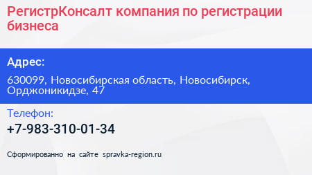 РегистрКонсалт, компания по регистрации бизнеса по адресу 630099, Новосибирская область, Новосибирск, Орджоникидзе, 47 в дальнейшем Организация, размещена в следующих категориях: