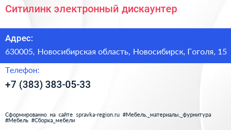 Ситилинк, электронный дискаунтер по адресу 630005, Новосибирская область, Новосибирск, Гоголя, 15 в дальнейшем Организация, размещена в следующих категориях: