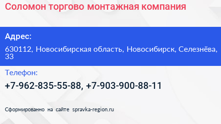 Соломон, торгово-монтажная компания по адресу 630112, Новосибирская область, Новосибирск, Селезнёва, 33 в дальнейшем Организация, размещена в следующих категориях: