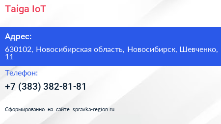 Taiga IoT по адресу 630102, Новосибирская область, Новосибирск, Шевченко, 11 в дальнейшем Организация, размещена в следующих категориях: