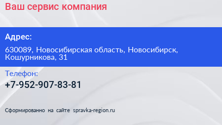 Ваш сервис, компания по адресу 630089, Новосибирская область, Новосибирск, Кошурникова, 31 в дальнейшем Организация, размещена в следующих категориях: