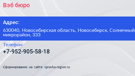 Вэб-бюро по адресу 630040, Новосибирская область, Новосибирск, Солнечный микрорайон, 333 в дальнейшем Организация, размещена в следующих категориях: