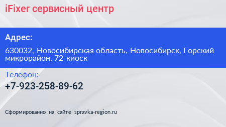 iFixer, сервисный центр по адресу 630032, Новосибирская область, Новосибирск, Горский микрорайон, 72 киоск в дальнейшем Организация, размещена в следующих категориях: