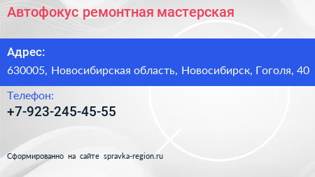 Автофокус, ремонтная мастерская по адресу 630005, Новосибирская область, Новосибирск, Гоголя, 40 в дальнейшем Организация, размещена в следующих категориях: