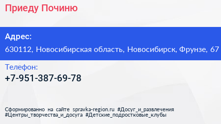 Приеду-Починю по адресу 630112, Новосибирская область, Новосибирск, Фрунзе, 67 в дальнейшем Организация, размещена в следующих категориях: