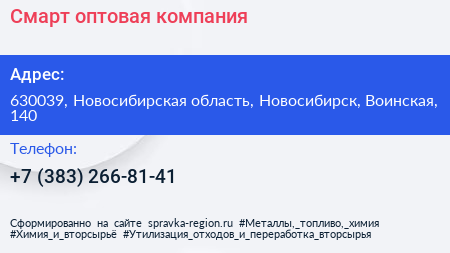 Смарт, оптовая компания по адресу 630039, Новосибирская область, Новосибирск, Воинская, 140 в дальнейшем Организация, размещена в следующих категориях: